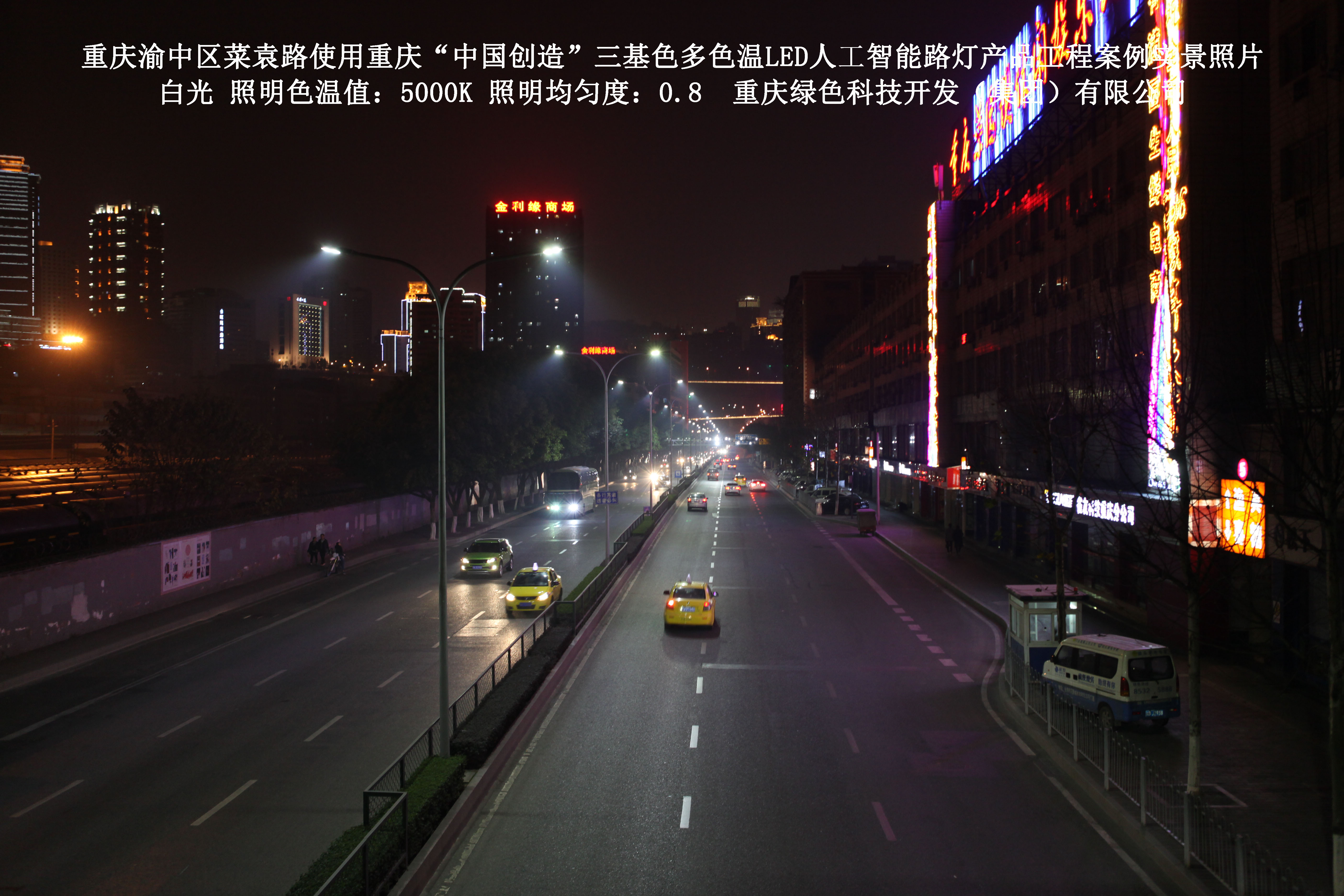2013年10月,重慶市城市照明管理局使用了我司研發制造的重慶“中國創造”三基色多色溫LED人工智能路燈,對渝中區菜袁路實施了綠色照明科技節能改造工程,該工程已全面竣工。工程實施后,極大地提高了城市照明清晰度、燈光均勻度、舒適度。通過智能終端實現單燈感知、線纜防盜報警,與原高壓鈉燈相比,節能率60%以上,有效解決了關閉控制回路或間隔關燈方式造成的照明暗區,確保行人和車輛通行的安全,實現城市路燈照明系統的智能化管理,推進了智慧城市建設。
