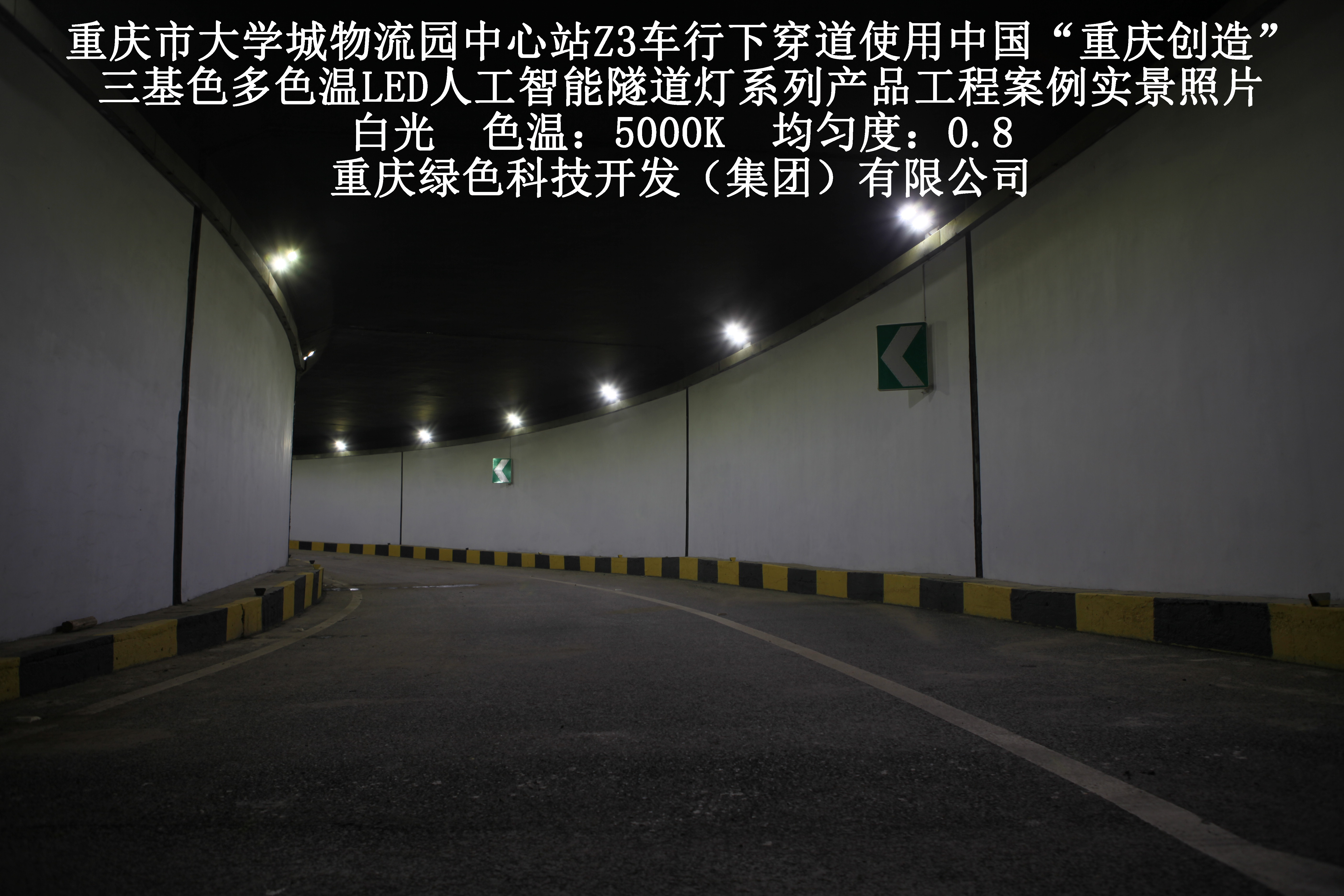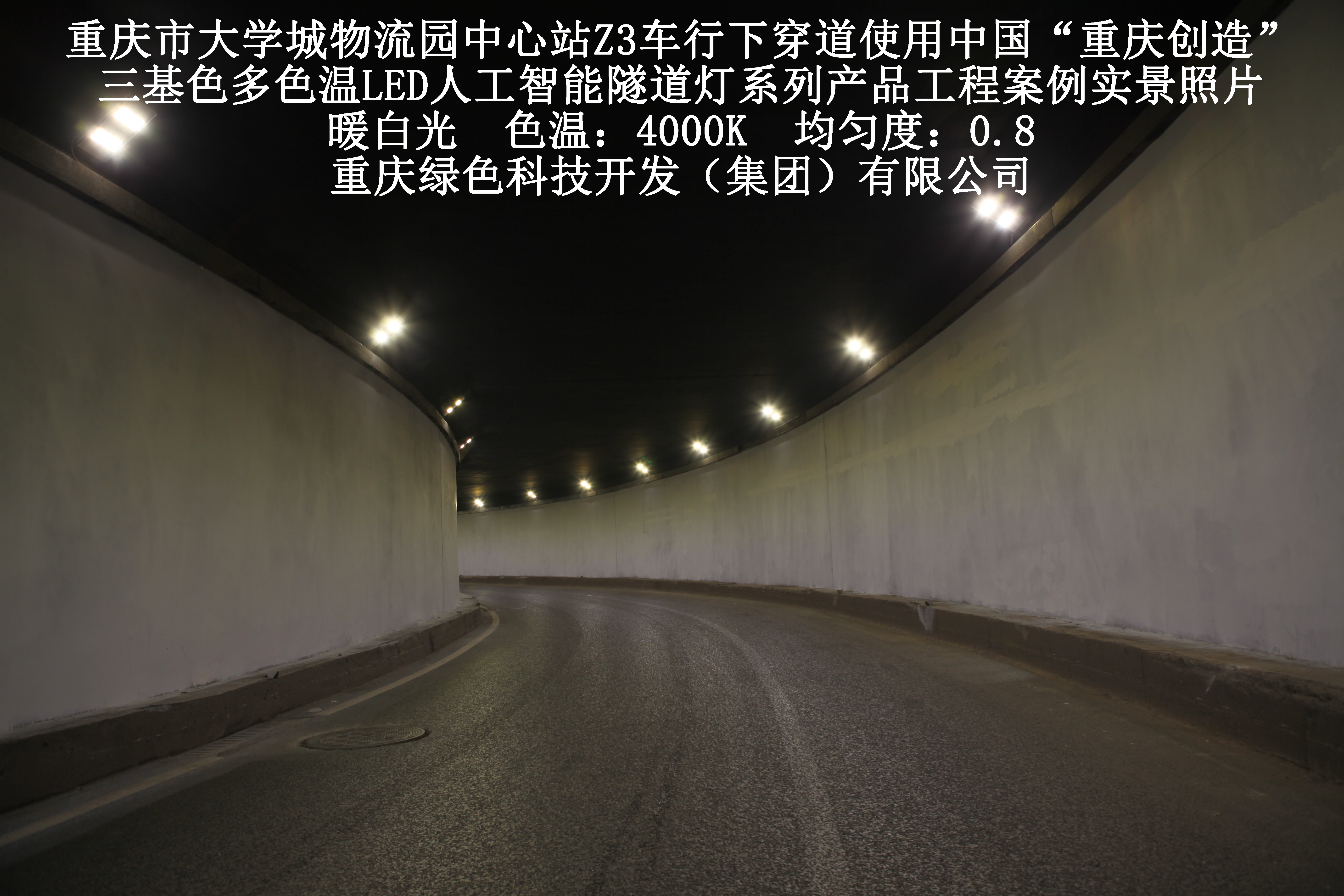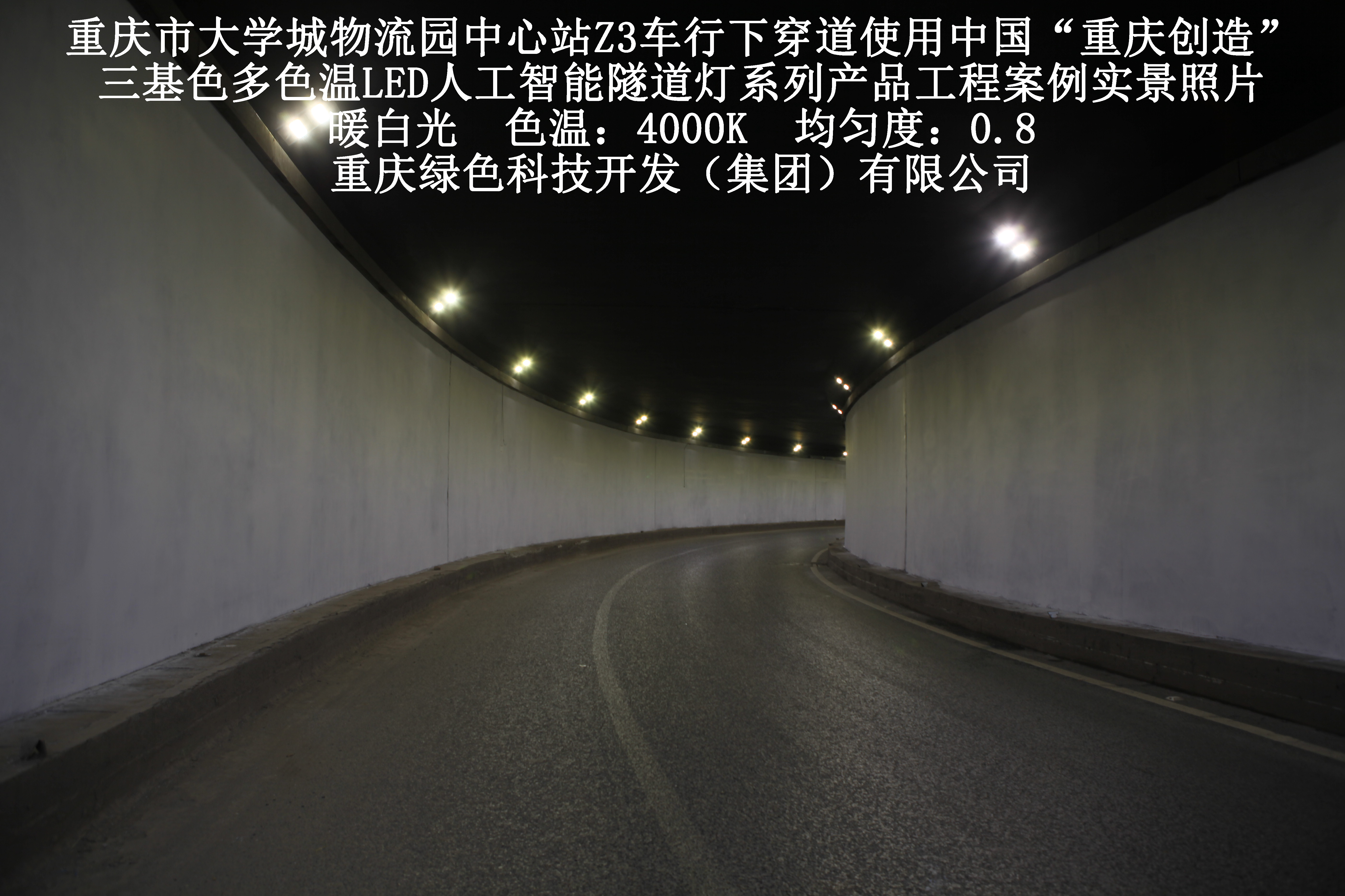 2019年3月,重慶市大學(xué)城物流園中心站Z3車行下穿道使用我司自主研發(fā)制造的,重慶“中國(guó)創(chuàng)造”三基色多色溫LED人工智能隧道燈系列產(chǎn)品,實(shí)施了市政設(shè)施品質(zhì)提升工程(工程案例實(shí)景照片附后)。此項(xiàng)目的實(shí)施,極大地提高了隧道內(nèi)照明清晰度、燈光均勻度、舒適度及照明安全性,實(shí)現(xiàn)了隧道照明系統(tǒng)的智能化管理。